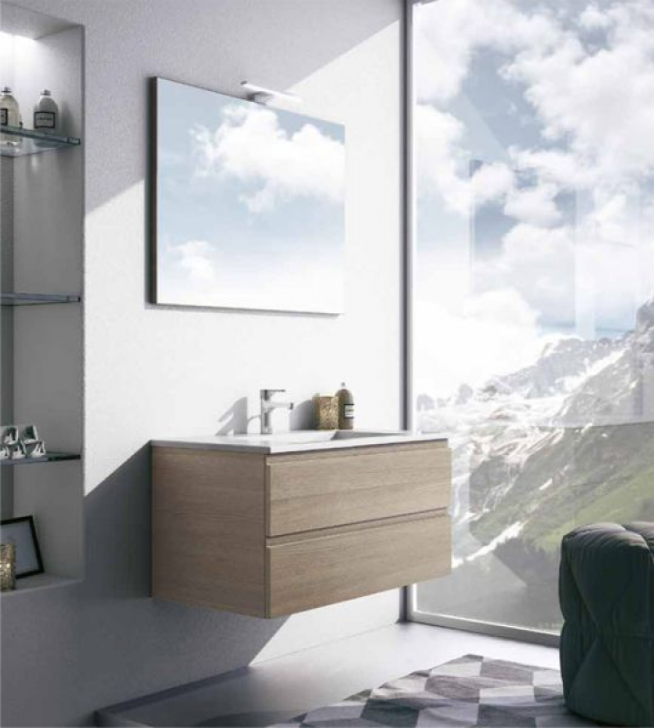 Abmessungen: 85 cm x 48 cm x 52 cm (BxHxT). Waschtisch: Keramik, weiß glänzend, fugenlos. Badmöbel-Oberfläche: 175X Ulme Grau. Unterschrank: 2 Schubladen. Griffe: grifflos. Spiegel: Modell Basic 85 cm x 72 cm x 2,5 cm (BxHxT). LED-Leuchte.
