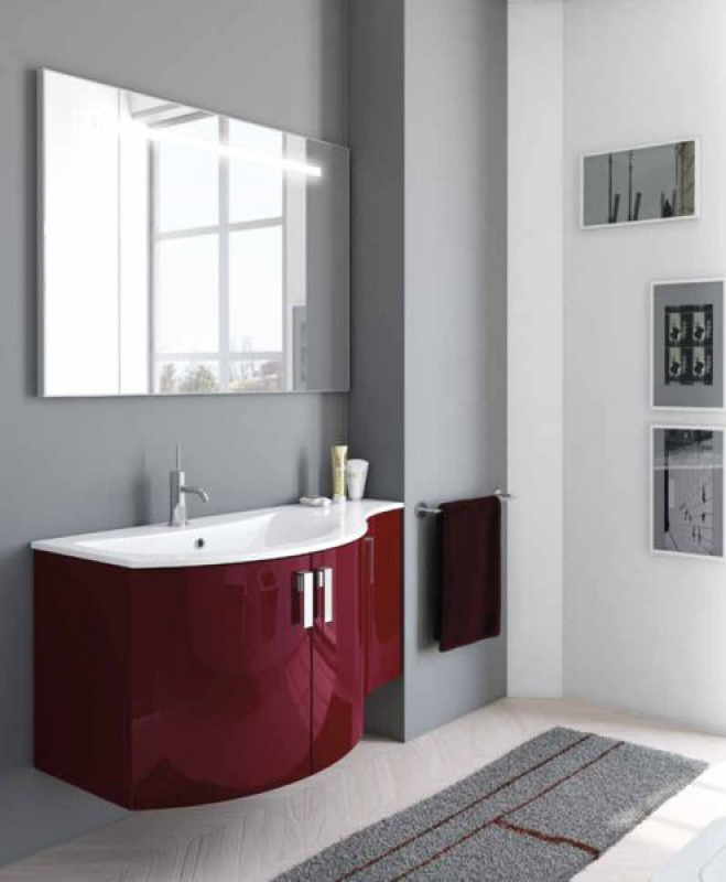Abmessungen: 103 cm x 48 cm x 52 cm / 35 cm / 21 cm, Waschtisch: Mineralguss, weiß glänzend, fugenlos. Badmöbel-Oberfläche: 151X Dunkelrot Hochglanz. Unterschrank: 2 gerundete Türen, 1 konkave Tür. Griffe: Sole. Spiegel: Modell Light 100 cm x 72 cm x 2,5 cm (BxHxT). Integrierte LED-Leuchte.