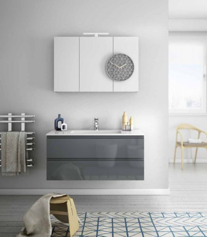 Abmessungen: 105 cm x 48 cm x 52 cm. Waschtisch: Mineralguss, weiß glänzend, fugenlos. Badmöbel-Oberfläche: 152X Anthrazit Hochglanz. Unterschrank: 2 Schubladen. Griffe: grifflos. Spiegelschrank: Modell Trittico 100 cm x 65 cm x 12 cm (BxHxT). LED-Leuchte.