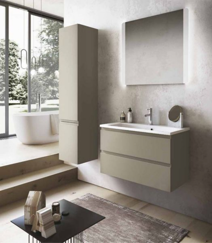 Abmessungen: 80 cm x 48 cm x 40 cm. Waschtisch: Mineralguss, weiß glänzend, fugenlos. Badmöbel-Oberfläche: 161X Steingrau Matt. Unterschrank: 2 Schubladen. Griffe: grifflos. Spiegel (optional): Modell Gaia 120 cm x 72 cm x 2,5 cm (BxHxT).