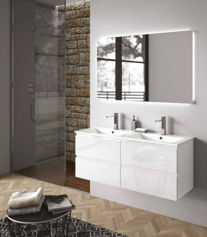 Abmessungen: 120 cm x 48 cm x 40 cm. Waschtisch: Keramik, weiß glänzend, fugenlos. Badmöbel-Oberfläche: 150X Weiß Hochglanz. Unterschrank: 4 Schubladen. Griffe: grifflos. Spiegel (optional): Modell Lux4 120 cm x 72 cm (BxH).