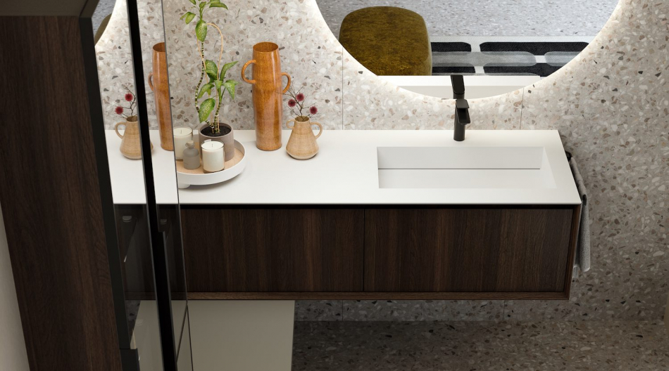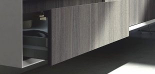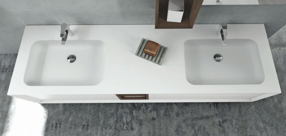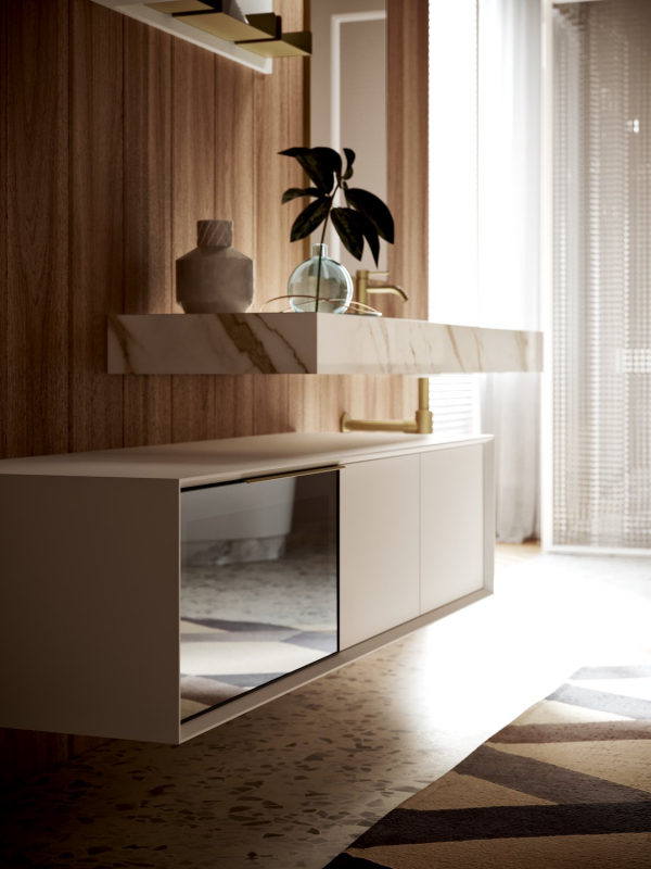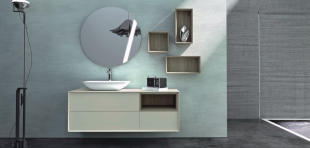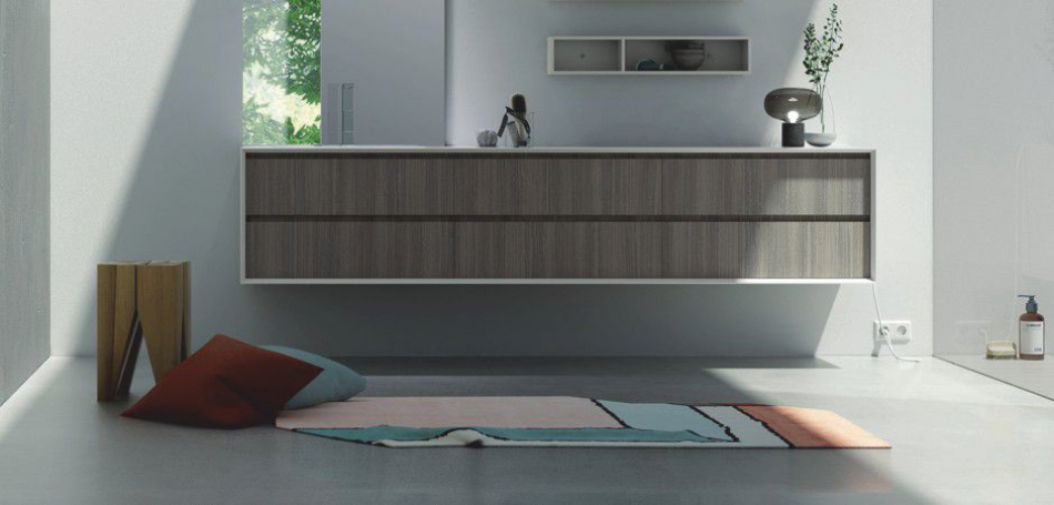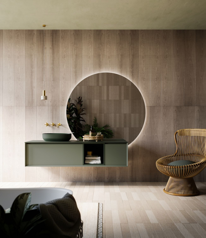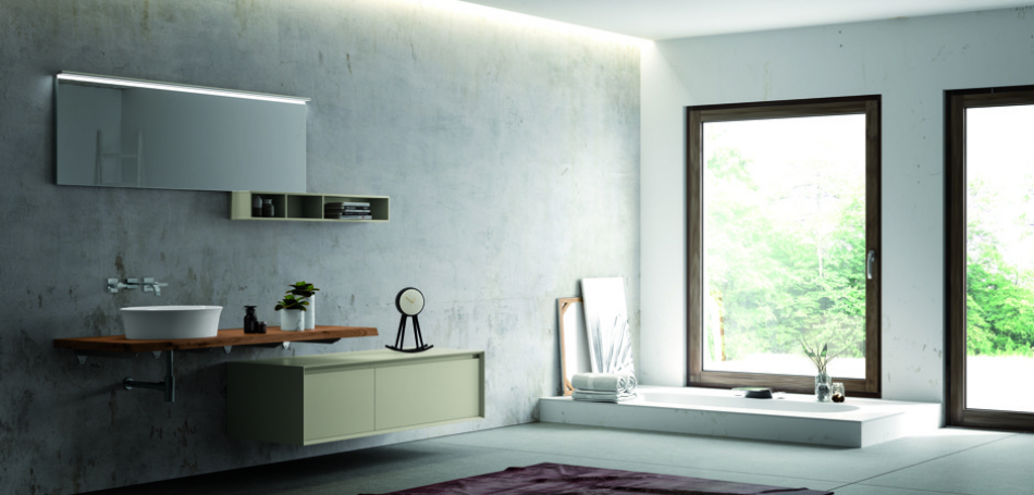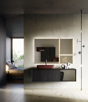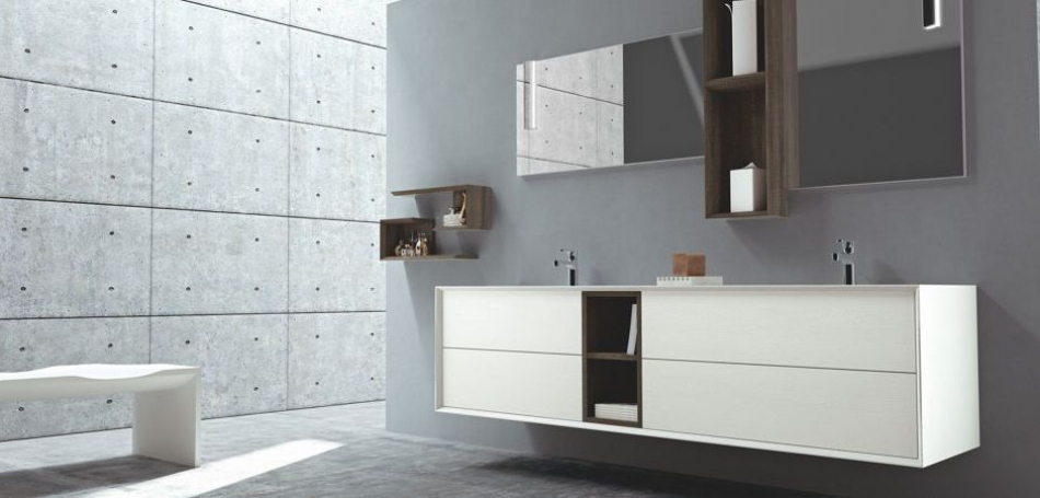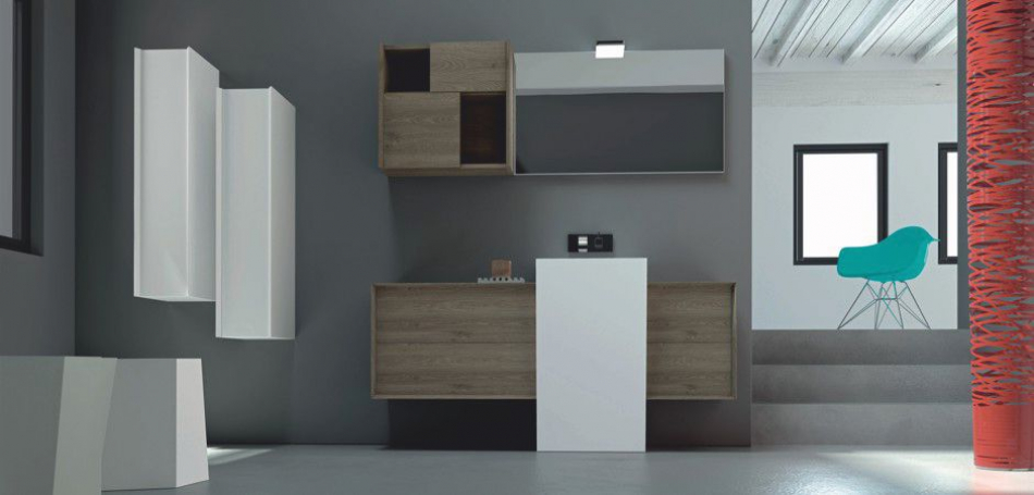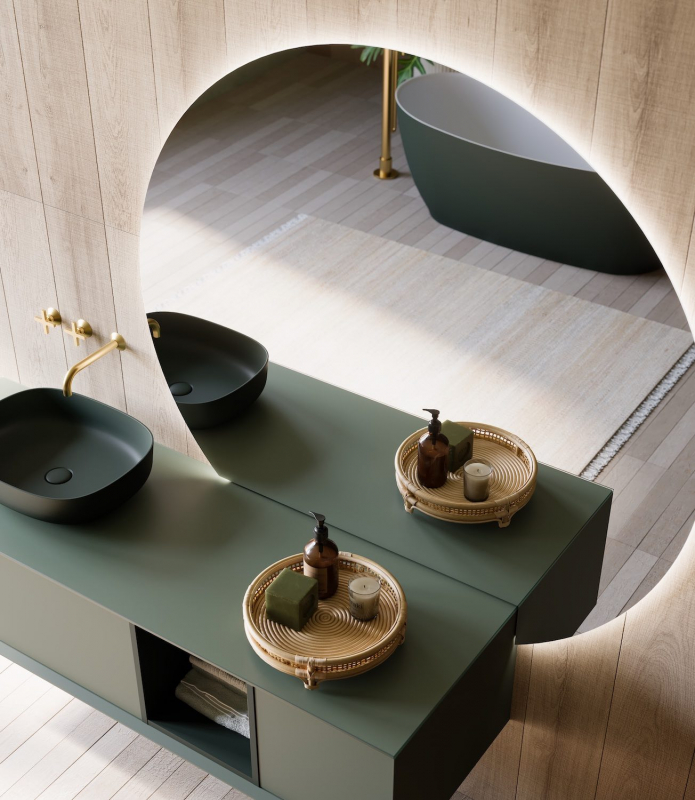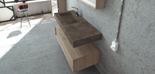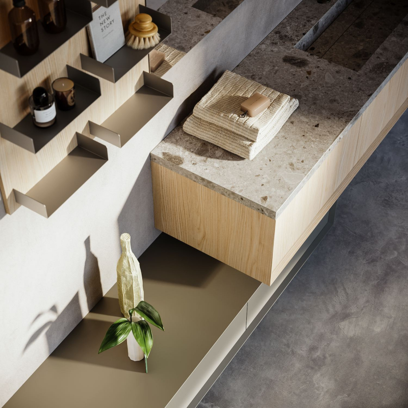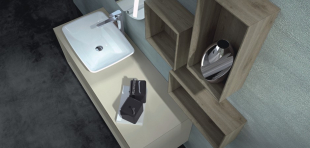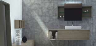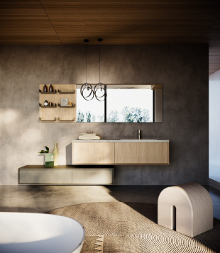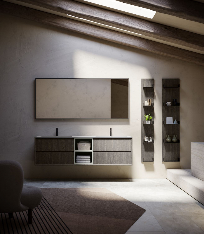 Waschplatz mit Auflagebecken aus Tecnoril Weiß matt. Waschtischplatte auf Maß aus Holz in Ares Valletta, Breite 180 cm, Tiefe 53,7 cm. Waschtisch-Unterschrank mit 1 Schublade, 2 Unterschränke mit je 1 Schublade, offenes Wandregal (Eiche Naturholz). Spiegel auf Maß mit Leuchten STRIP. Badmöbel-Programm MODULA. Badmöbel-Oberfläche / -Farbe: Ares Valletta