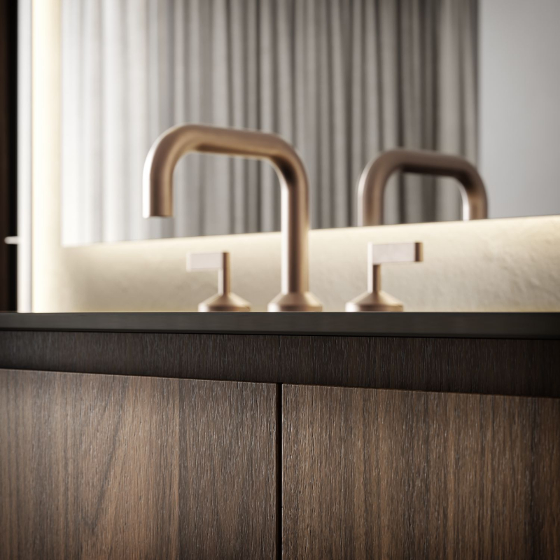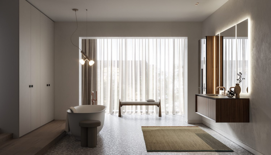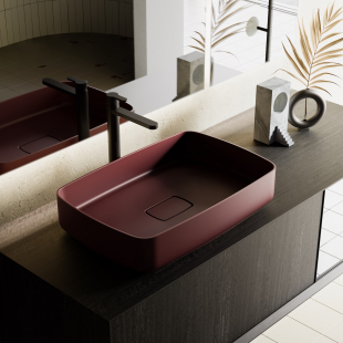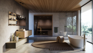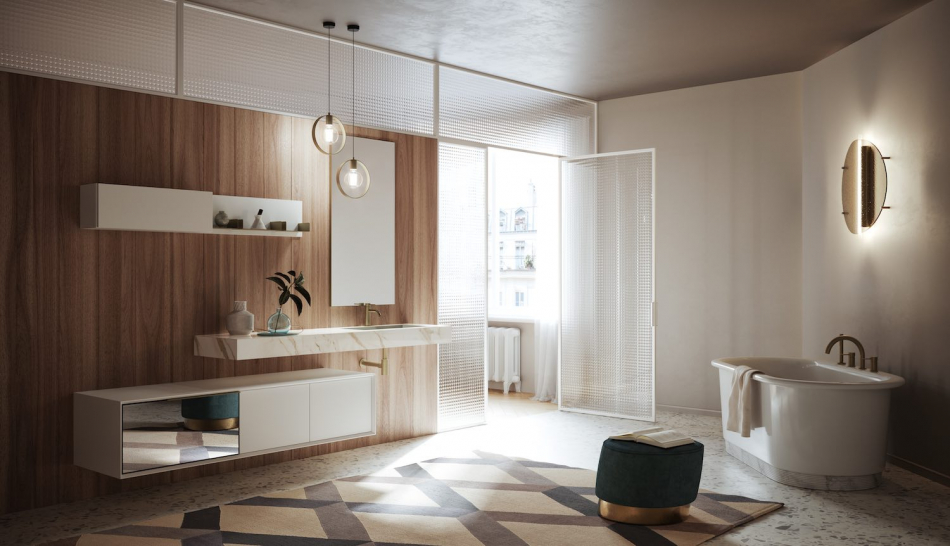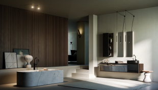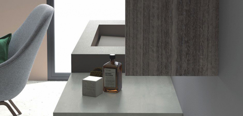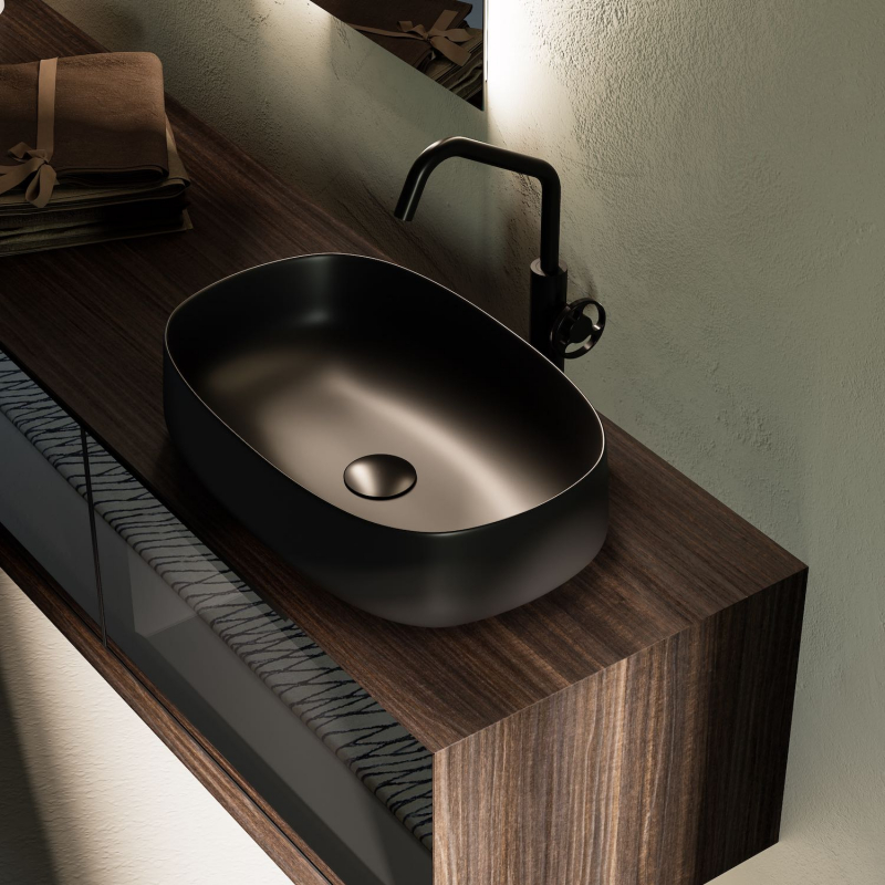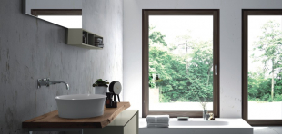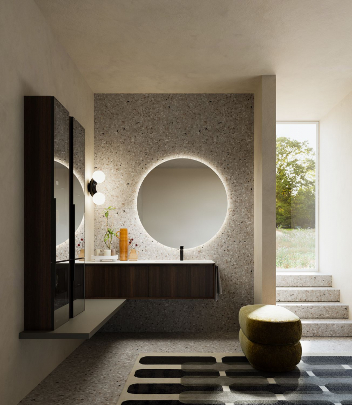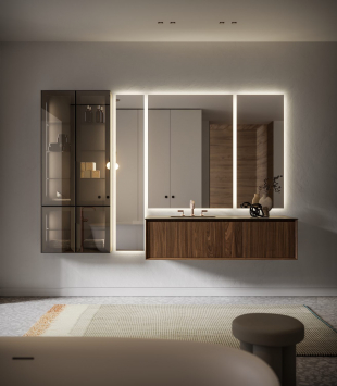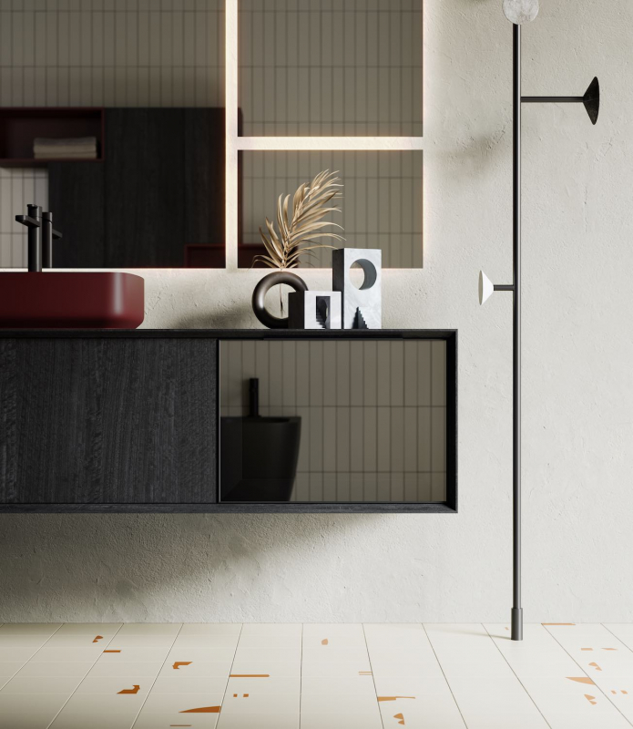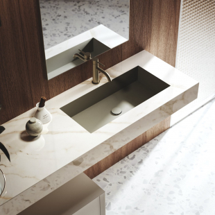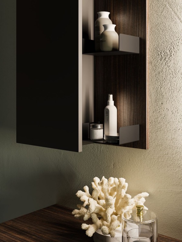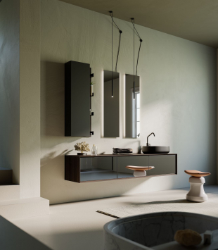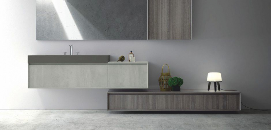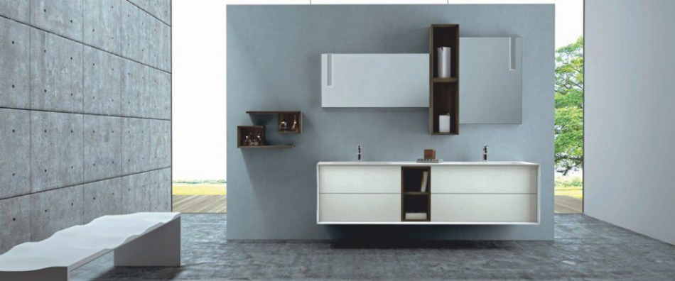 Waschplatz mit Auflagebecken aus Tecnoril Weiß matt. Waschtischplatte auf Maß aus Holz in Ares Valletta, Breite 180 cm, Tiefe 53,7 cm. Waschtisch-Unterschrank mit 1 Schublade, 2 Unterschränke mit je 1 Schublade, offenes Wandregal (Eiche Naturholz). Spiegel auf Maß mit Leuchten STRIP. Badmöbel-Programm MODULA. Badmöbel-Oberfläche / -Farbe: Ares Valletta