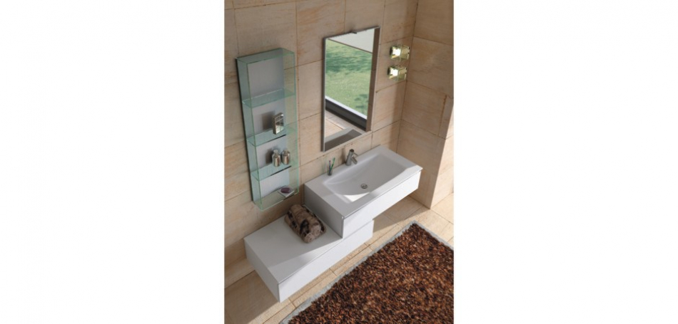 Weitere Produkte der abgebildeten Badmöbel-Kombination: Waschtisch-Unterschrank Breite 100 cm mit 1 Auszug / Schublade, Unterschrank Breite 100 cm mit 1 Ausug / Schublade, Abdeckplatte auf Maß Breite 60 cm, offenes Glas-Regal Cube Breite 35 cm x Höhe 117 cm x Tiefe 19 cm, Badezimmerspiegel auf Maß Breite 60 cm x Höhe 90 cm, LED-Leuchte.